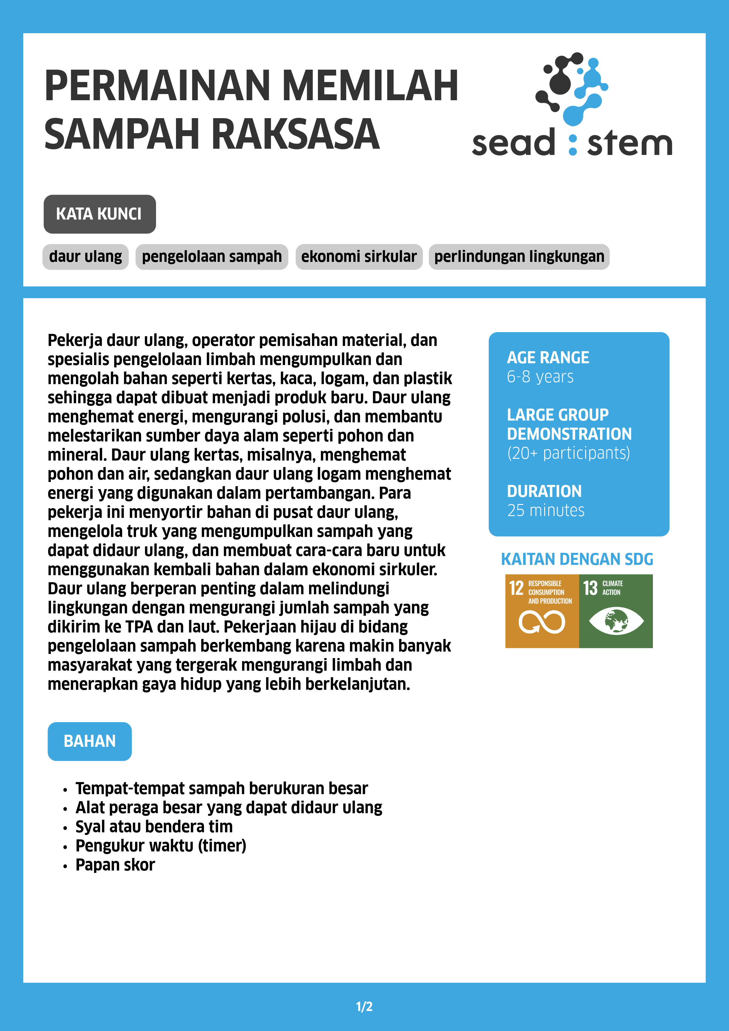 Permainan tim yang interaktif ini mengajak peserta berlomba memilah barang-barang besar yang dapat didaur ulang, kemudian memasukkan barang ke tempat sampah yang tepat.