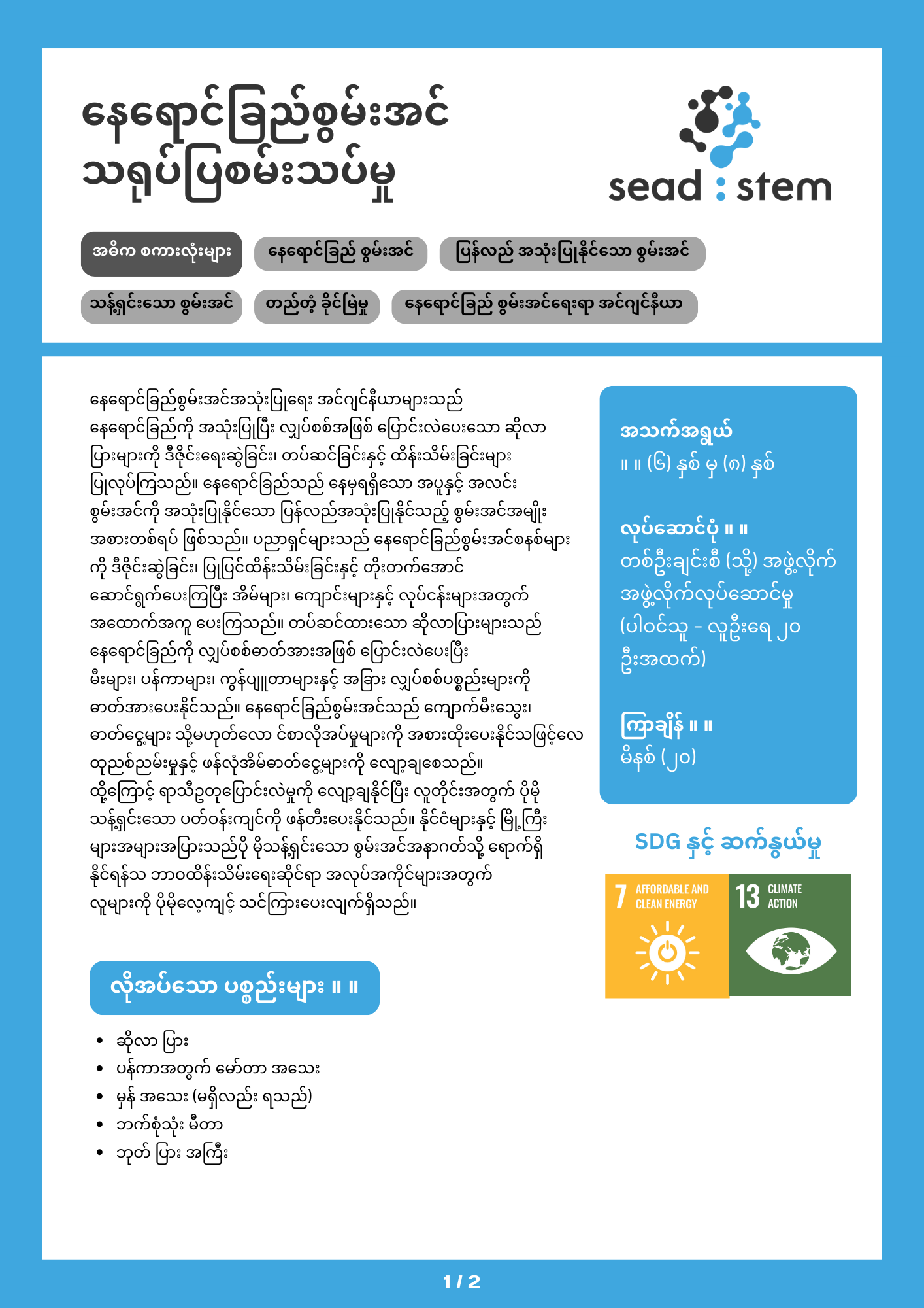 • ပြန်လည်အသုံးပြုနိုင်သော စွမ်းအင် ထုတ်လုပ်ခြင်း။ အိမ်များ၊ ကျောင်းများနှင့် စီးပွားရေးလုပ်ငန်းများအတွက် နေရောင်ခြည်ကို ဖမ်းယူပြီး လျှပ်စစ်စွမ်းအင်အဖြစ် ပြောင်းလဲရန် နေရောင်ခြည် ပန်းနယ်များကို တည်ဆောက်တပ်ဆင်ခြင်း။
