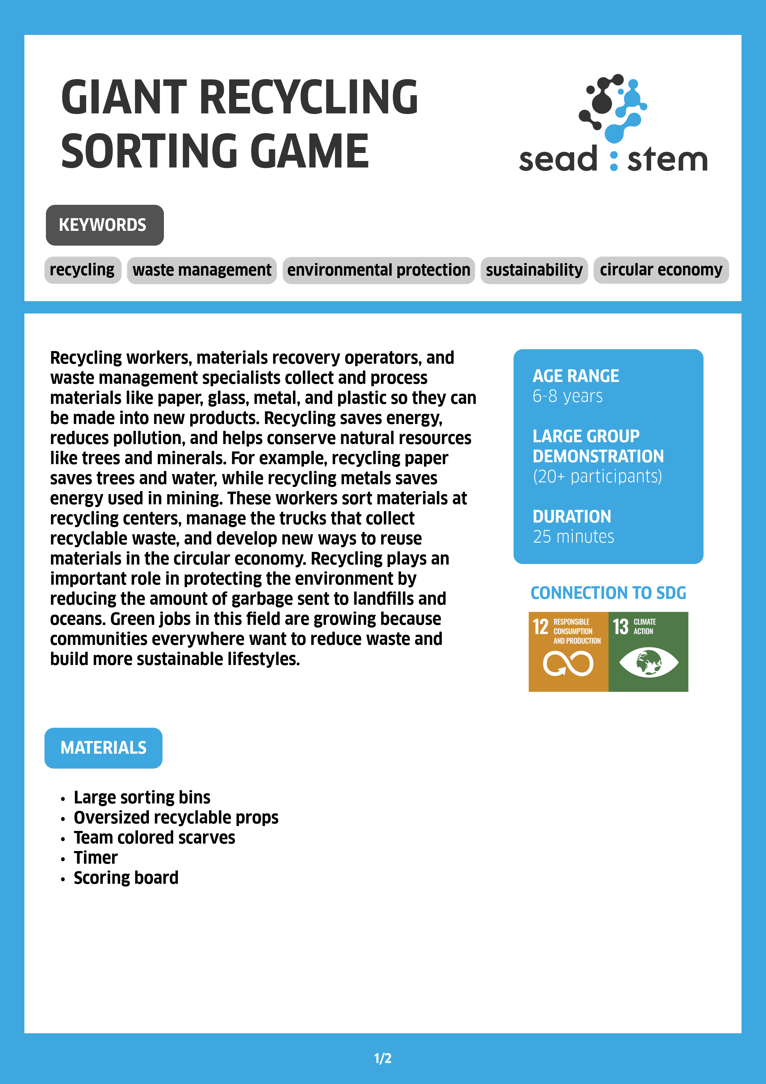An interactive team game where students race to sort oversized recyclable items into the correct bins.