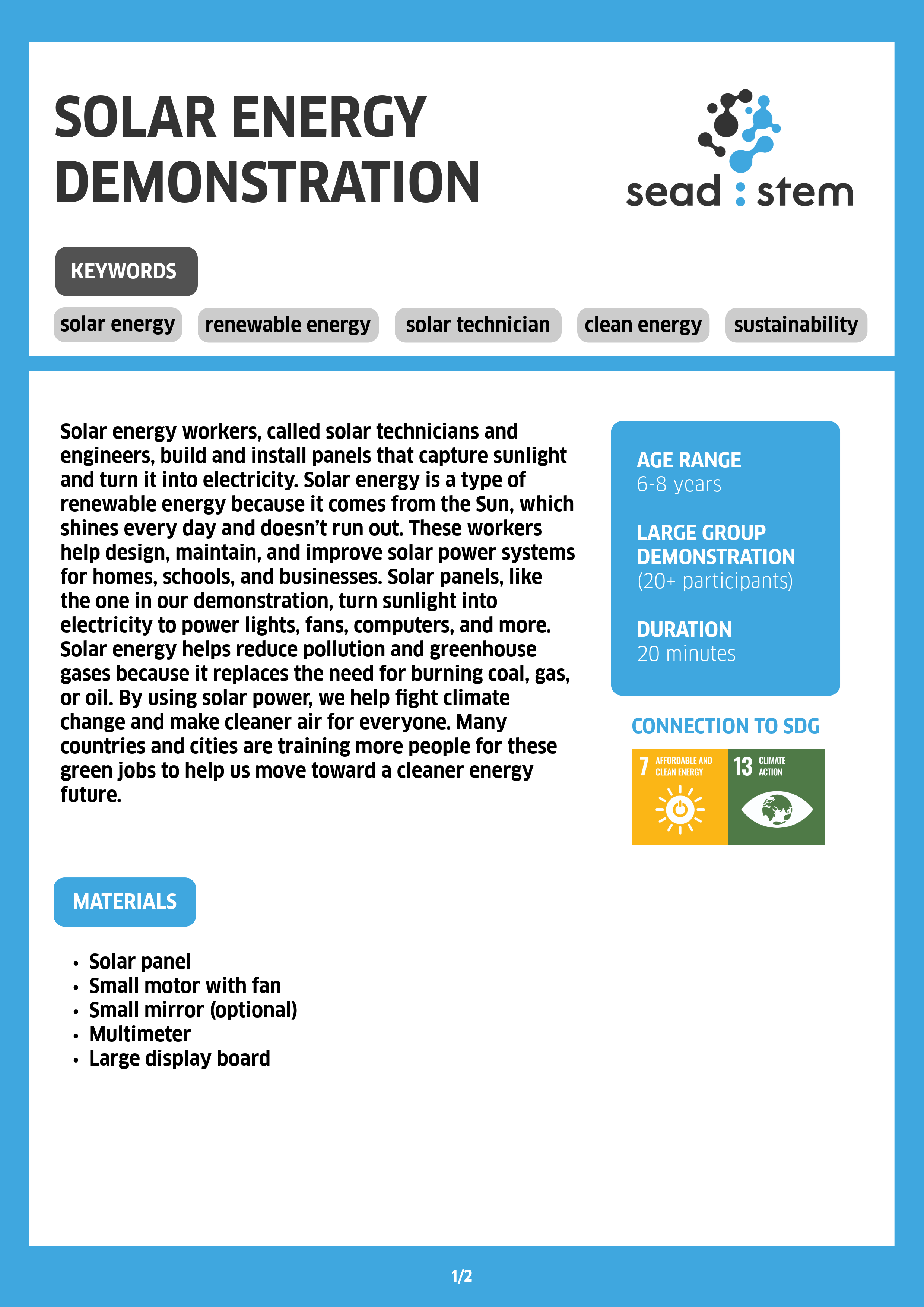 Solar energy workers, called solar technicians and engineers, build and install panels that capture sunlight and turn it into electricity. Solar energy is a type of renewable energy because it comes from the Sun, which shines every day and doesn’t run out. These workers help design, maintain, and improve solar power systems for homes, schools, and businesses. Solar panels, like the one in our demonstration, turn sunlight into electricity to power lights, fans, computers, and more. Solar energy helps reduce pollution and greenhouse gases because it replaces the need for burning coal, gas, or oil. By using solar power, we help fight climate change and make cleaner air for everyone. Many countries and cities are training more people for these green jobs to help us move toward a cleaner energy future.