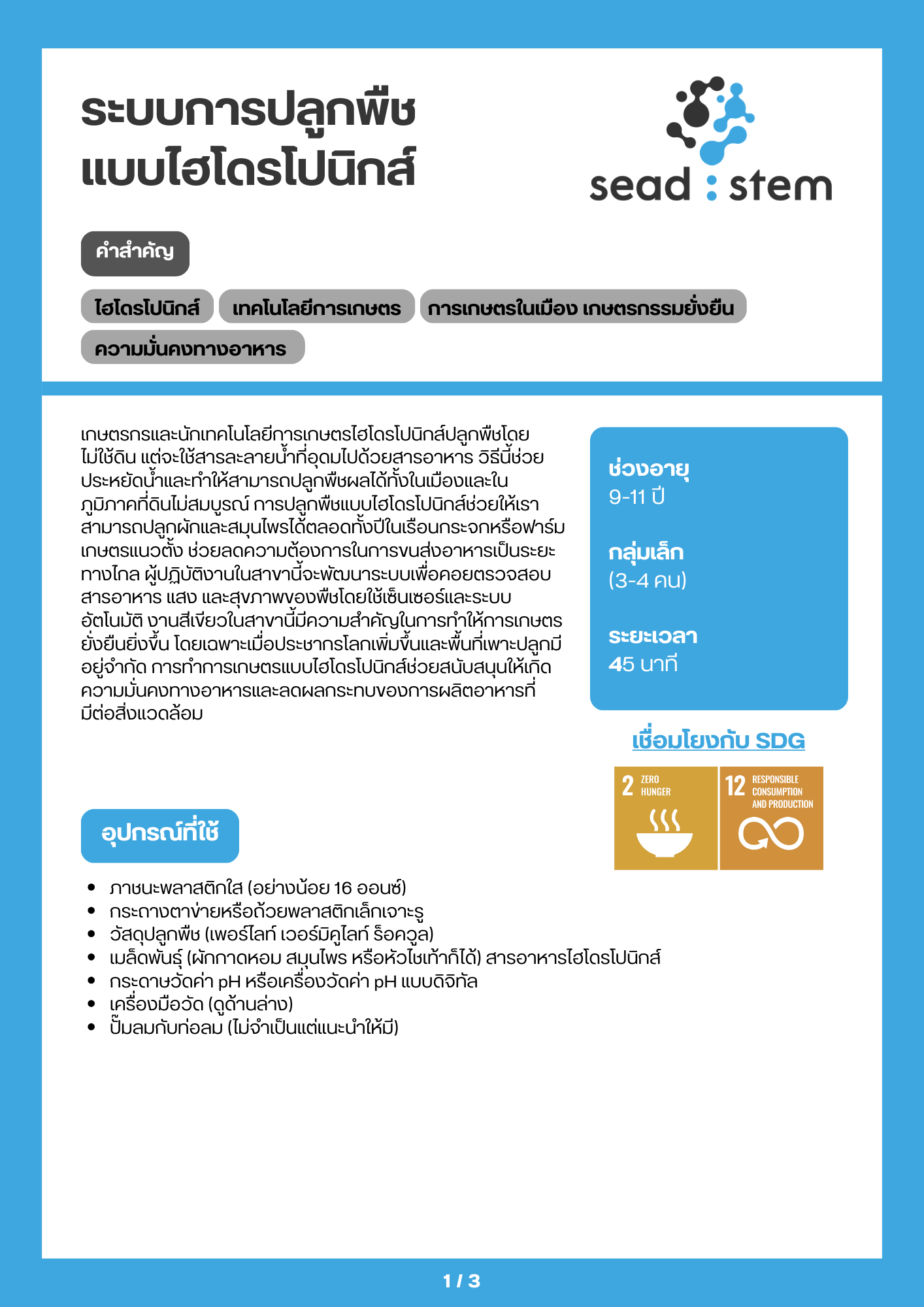- แนะนำผู้เรียนให้รู้จักระบบการปลูกพืชแบบไฮโดรโปนิกส์ และวิธีที่พืชสามารถเจริญเติบโตได้โดยไม่ใช้ดินในสภาพแวดล้อมที่ควบคุมด้วยน้ำ;