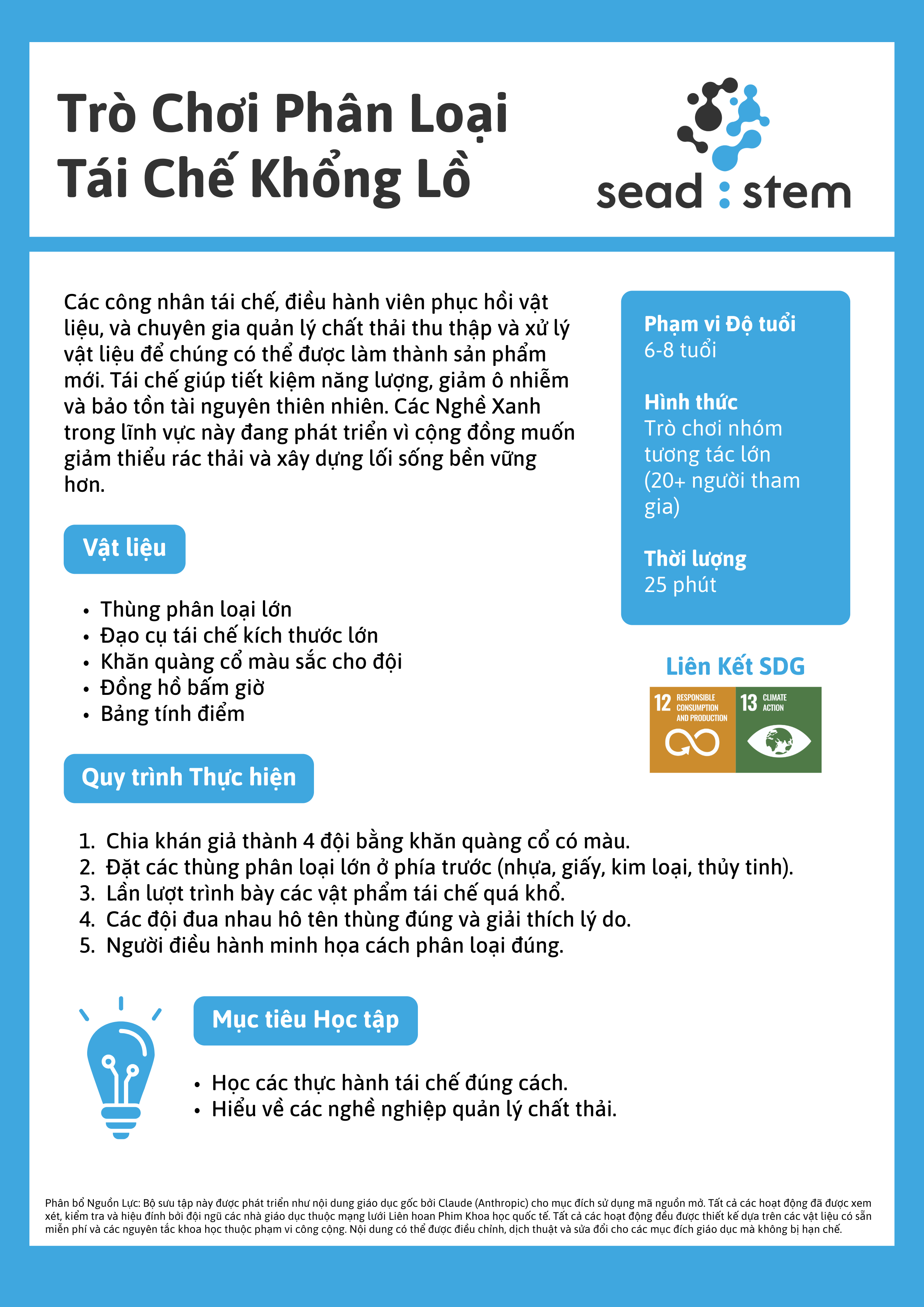 Một trò chơi đồng đội tương tác, nơi học sinh chạy đua phân loại các vật phẩm tái chế cỡ lớn vào đúng thùng. Hoạt động giúp học các thực hành tái chế đúng cách và hiểu về các nghề nghiệp quản lý chất thải.